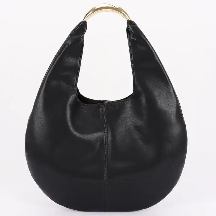 * Faux Leather Hobo Bag * 14W*17H*2D * Polyurethane, Mixed Metal. * This Faux Leather Hobo Bag features a classic hobo bag silhouette with a faux leather construction. It has a sleek, metallic handle, giving it a stylish and modern appearance.