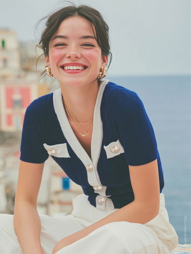 Blue Sweater with Pearl Buttons